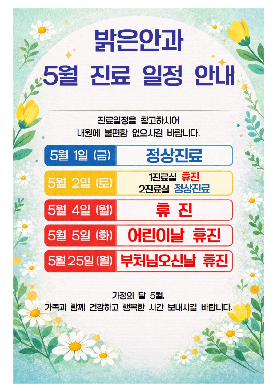 인쇄하기/글자확대.축소 기본 크게 더크게 인쇄 스크랩 목록보기 5월 휴진안내 페이지 정보 작성자.당진밝은안과 작성일.2026-04-16 17:29:50 조회.3 댓글.0 본문 인쇄하기/글자확대.축소 기본 크게 더크게 인쇄 스크랩 목록보기 다음글 ▼대표원장님 휴진안내 댓글목록 등록된 댓글이 없습니다. 다음글 목록보기