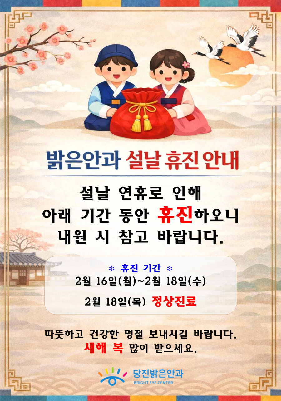 인쇄하기/글자확대.축소 기본 크게 더크게 인쇄 스크랩 목록보기 설날 휴진 안내 페이지 정보 작성자.당진밝은안과 작성일.2026-02-14 11:35:38 조회.85 댓글.0 본문 인쇄하기/글자확대.축소 기본 크게 더크게 인쇄 스크랩 목록보기 다음글 ▼12월 휴진 안내 댓글목록 등록된 댓글이 없습니다. 다음글 목록보기